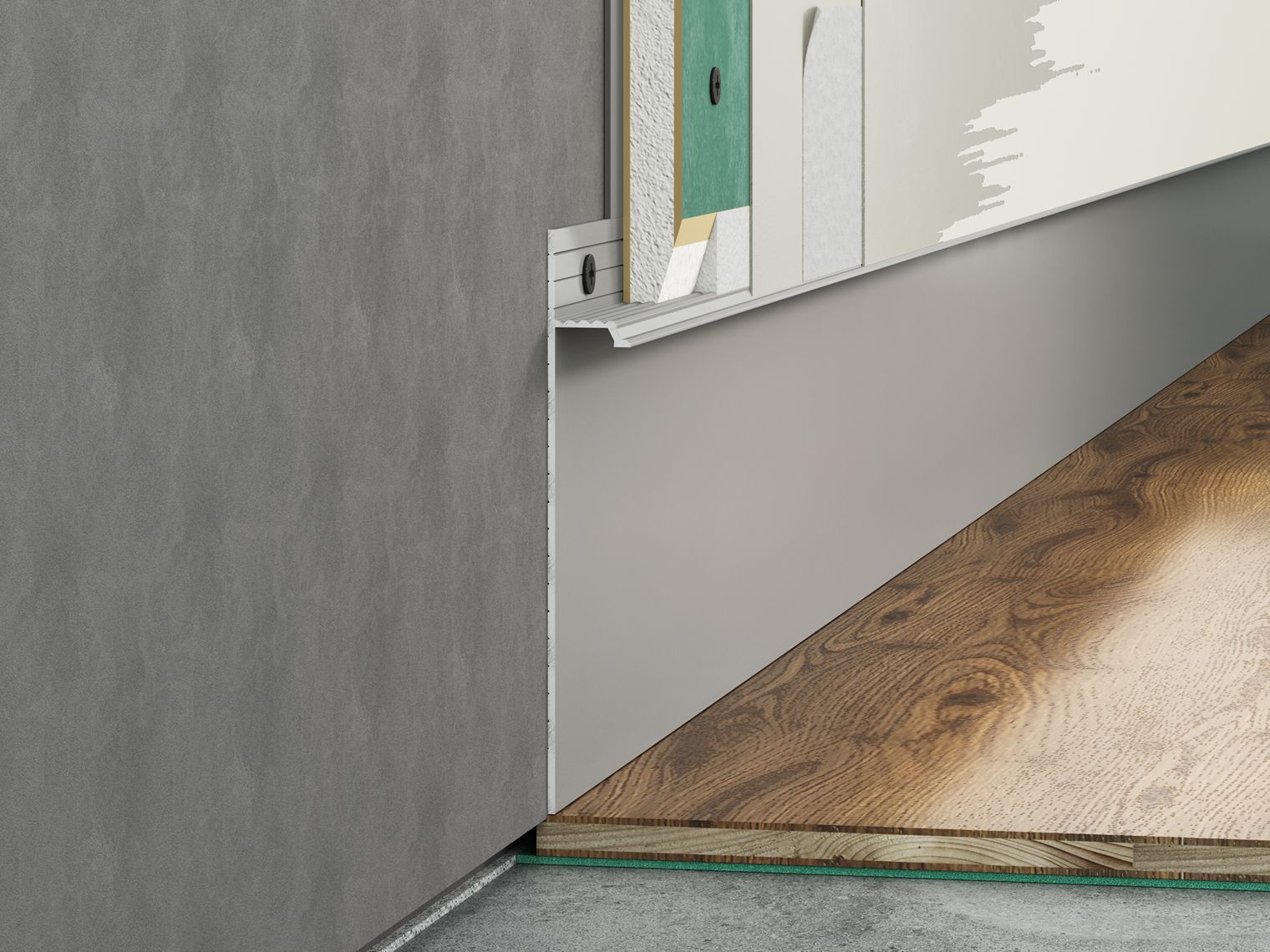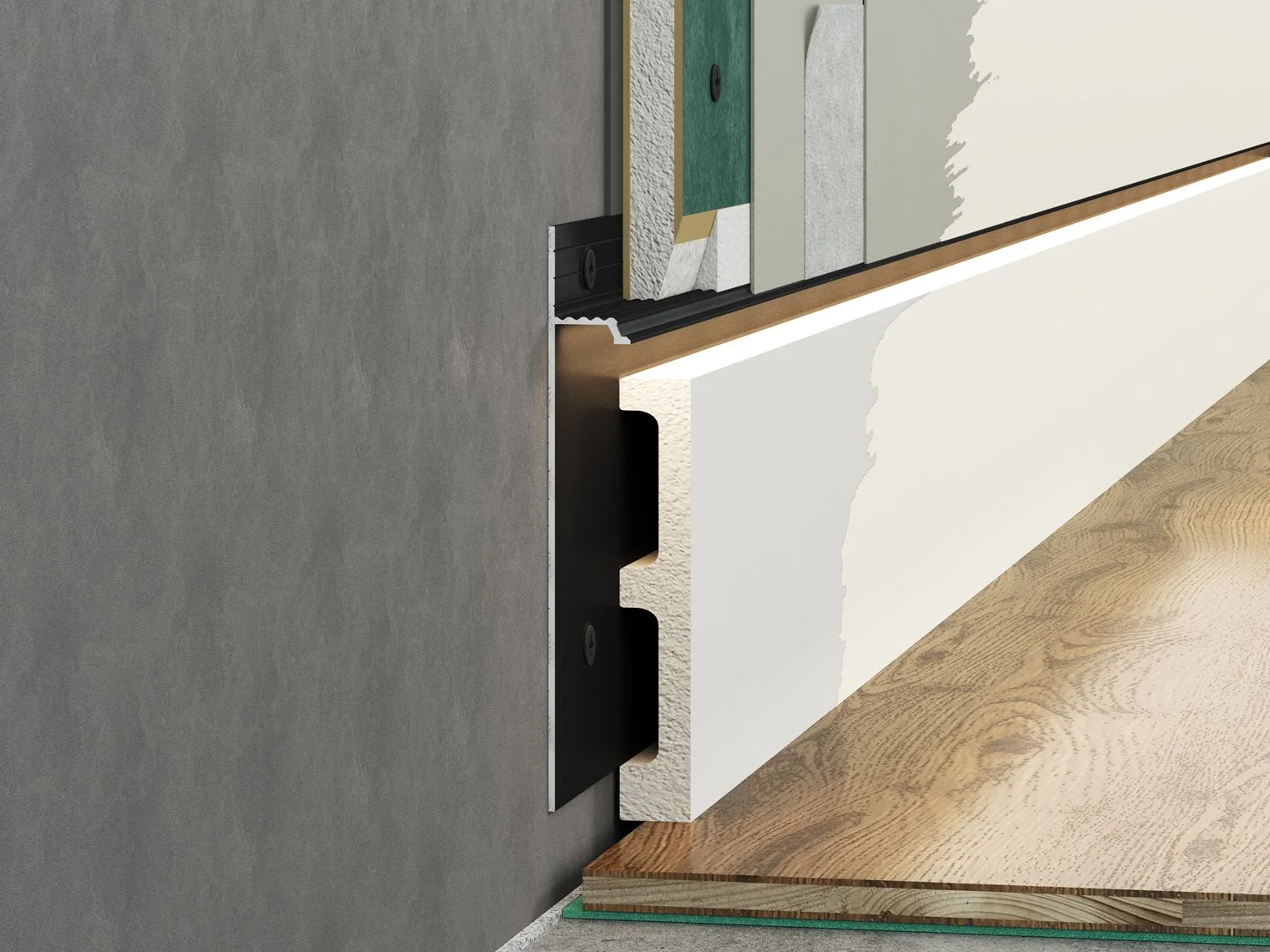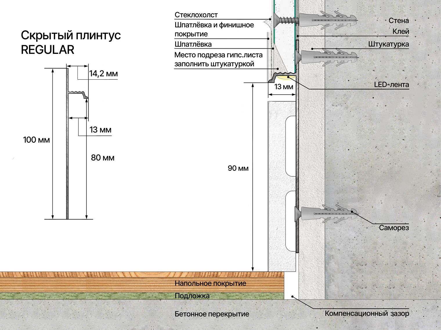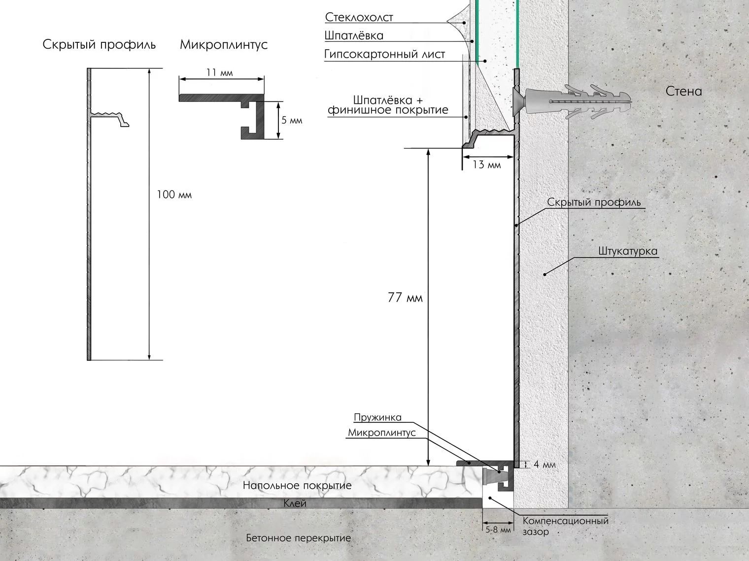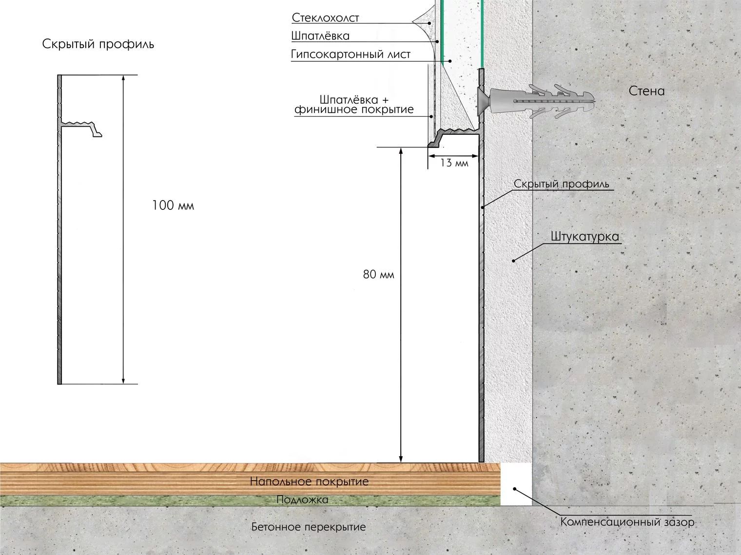 Скрытый профиль маскирует стык между стеной и напольным покрытием, зрительно увеличивает помещение, избавляет пространство от лишнего визуального шума и подчеркивает монументальность.