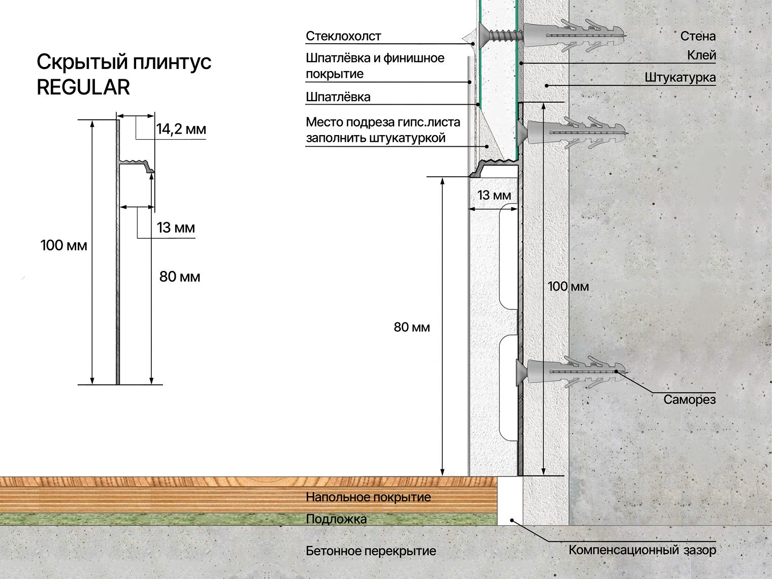 Предназначен для установки плинтуса в одной плоскости со стеной и маскировки компенсационного зазора между стеной и напольным покрытием. Состоит из алюминиевого профиля и декоративной вставки из ударопрочного дюрополимера 80 мм (вставка в комплект не входит).